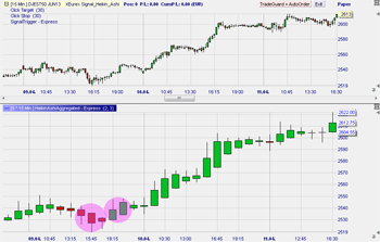 Dieses Beispiel zeigt ein Kaufsignal. Der obere Bildschirm zeigt den klassischen Kerzenchart in 15 Min. Der untere Bildschirm zeigt den Trendindikator Heikin Ashi in 5 x 15 Min.